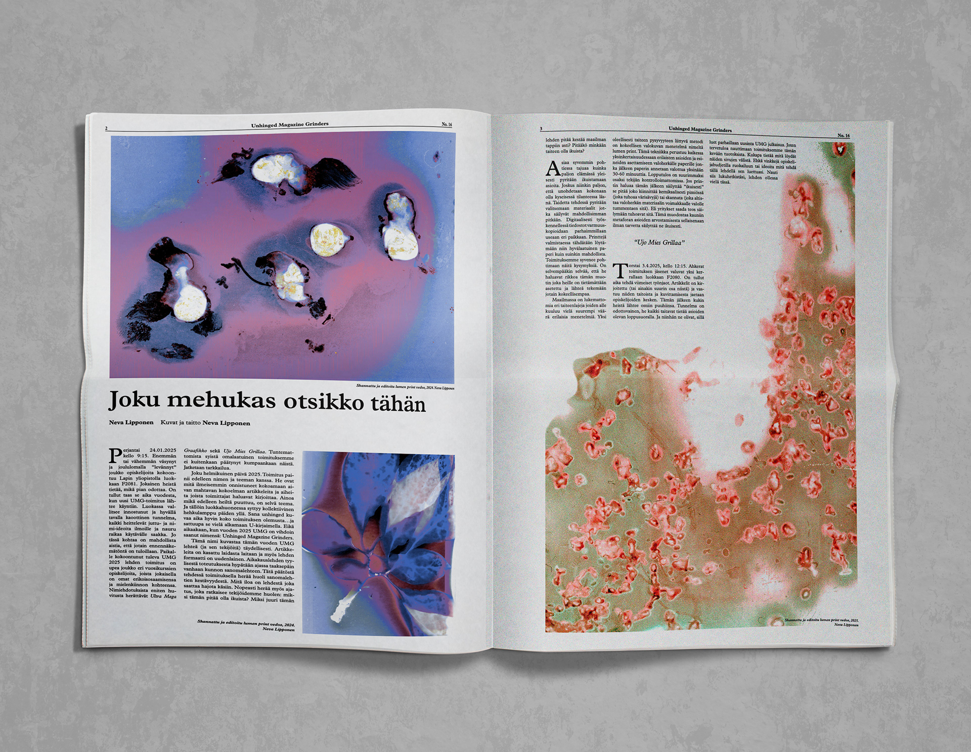 UMG is the annually released magazine by University of Lapland graphic design master students. Each year the students come together and create the magazine from scratch. In UMG 2025 I did the staff photography as well as layouts for two articles.